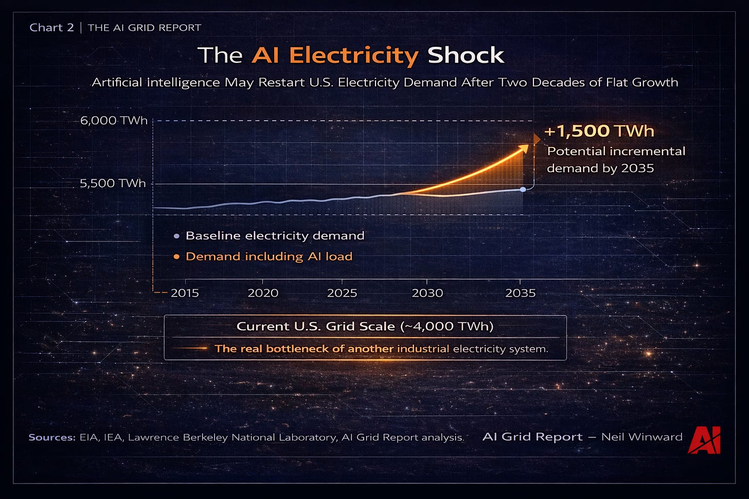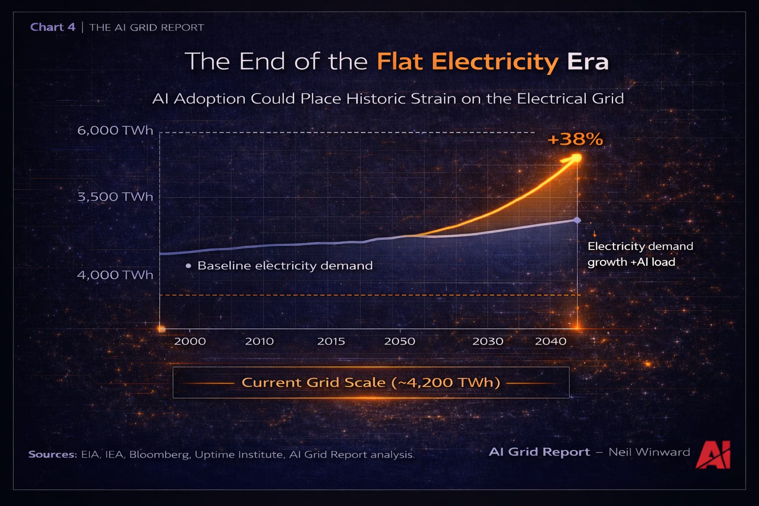 If AI adoption accelerates, electricity demand could begin rising again — potentially faster than the power system was designed to handle.
