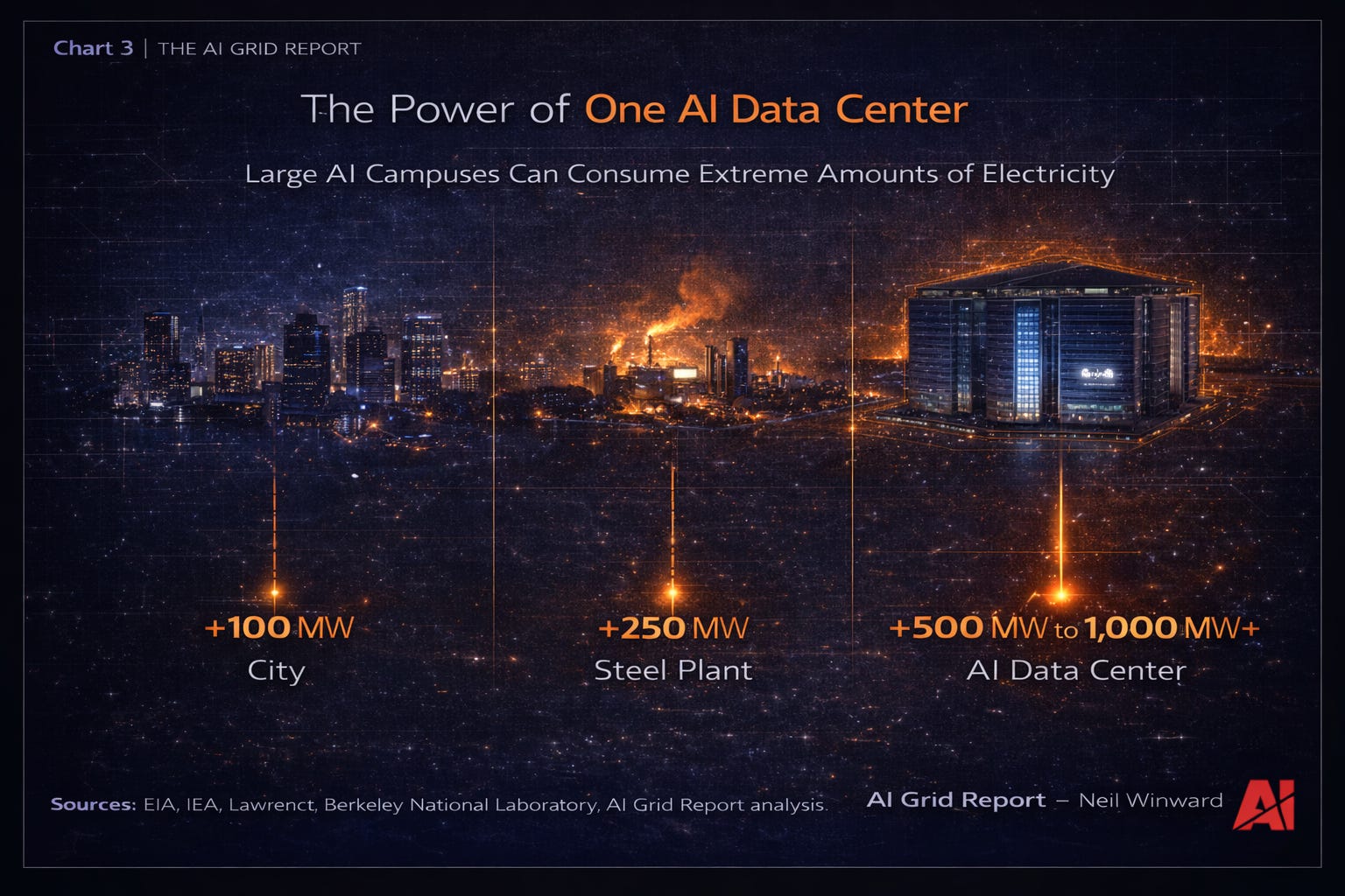 This comparison shows that a single AI data center campus can consume as much electricity as a small city.