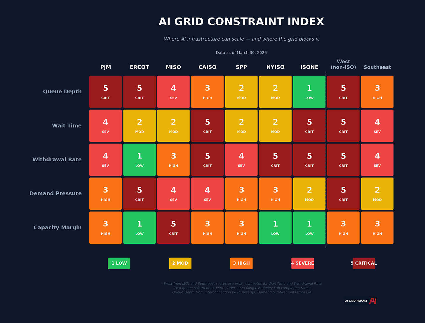 Each month, this newsletter publishes a heatmap scoring nine US grid regions across five constraint dimensions: queue depth, wait time, withdrawal rate, demand pressure, and capacity margin. Scores run from 1 to 5.