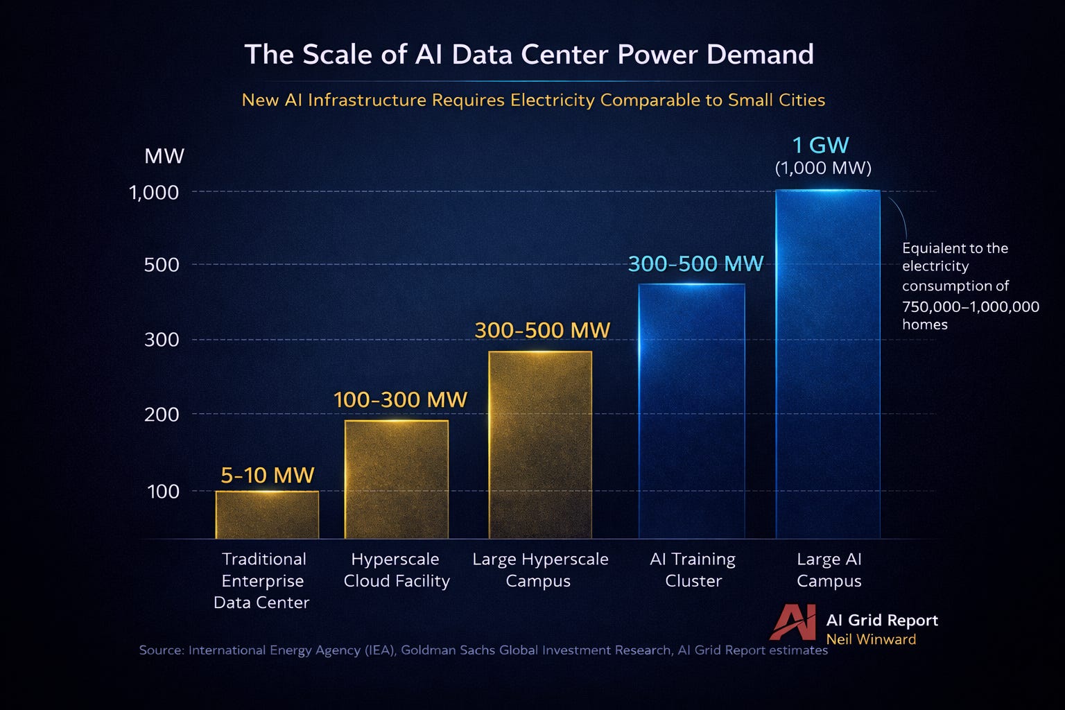 The largest AI campuses currently planned may require 1 gigawatt or more of continuous power.