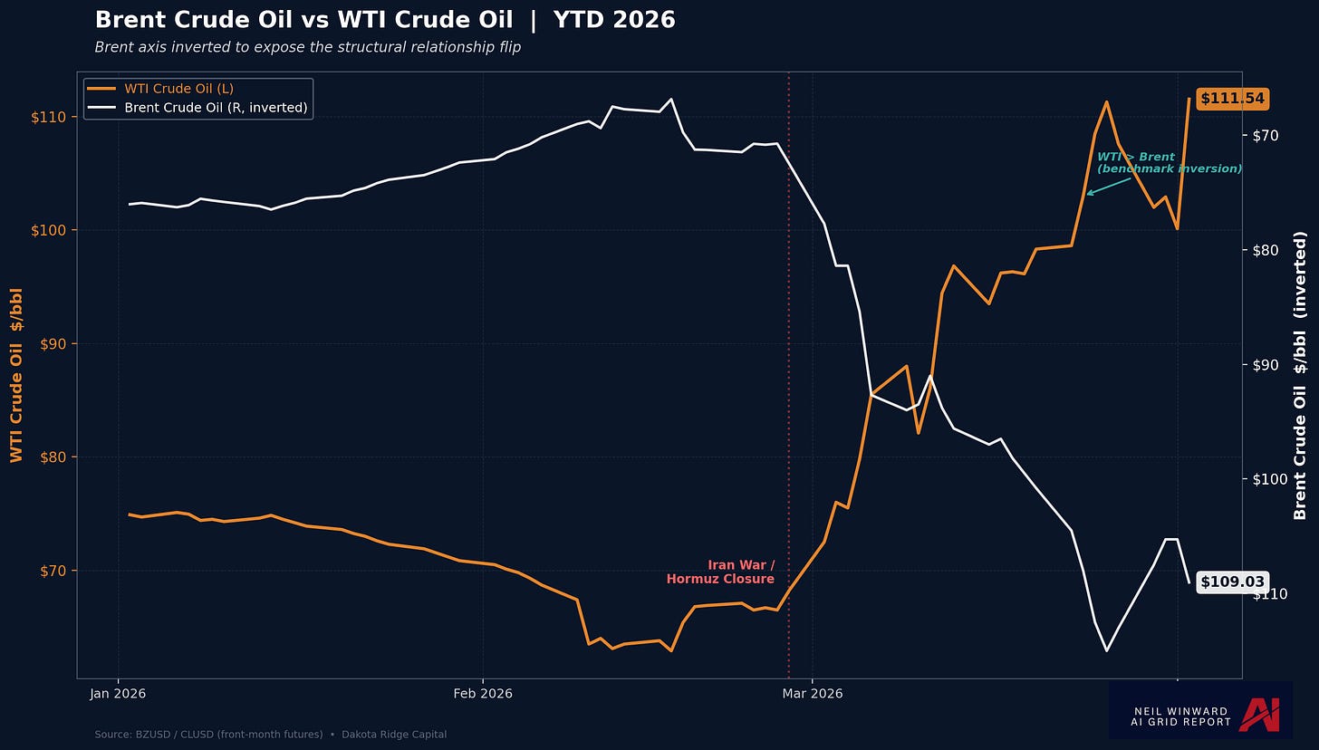 Then Brent and WTI flipped. The replacement for lost Middle East supply wasn’t prompt North Sea production. It was US exportable crude.
