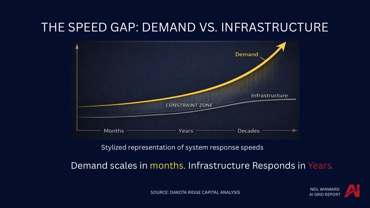 The gap is already visible. Demand compounds in months. Infrastructure responds in years. That gap doesn’t stabilize — it widens.